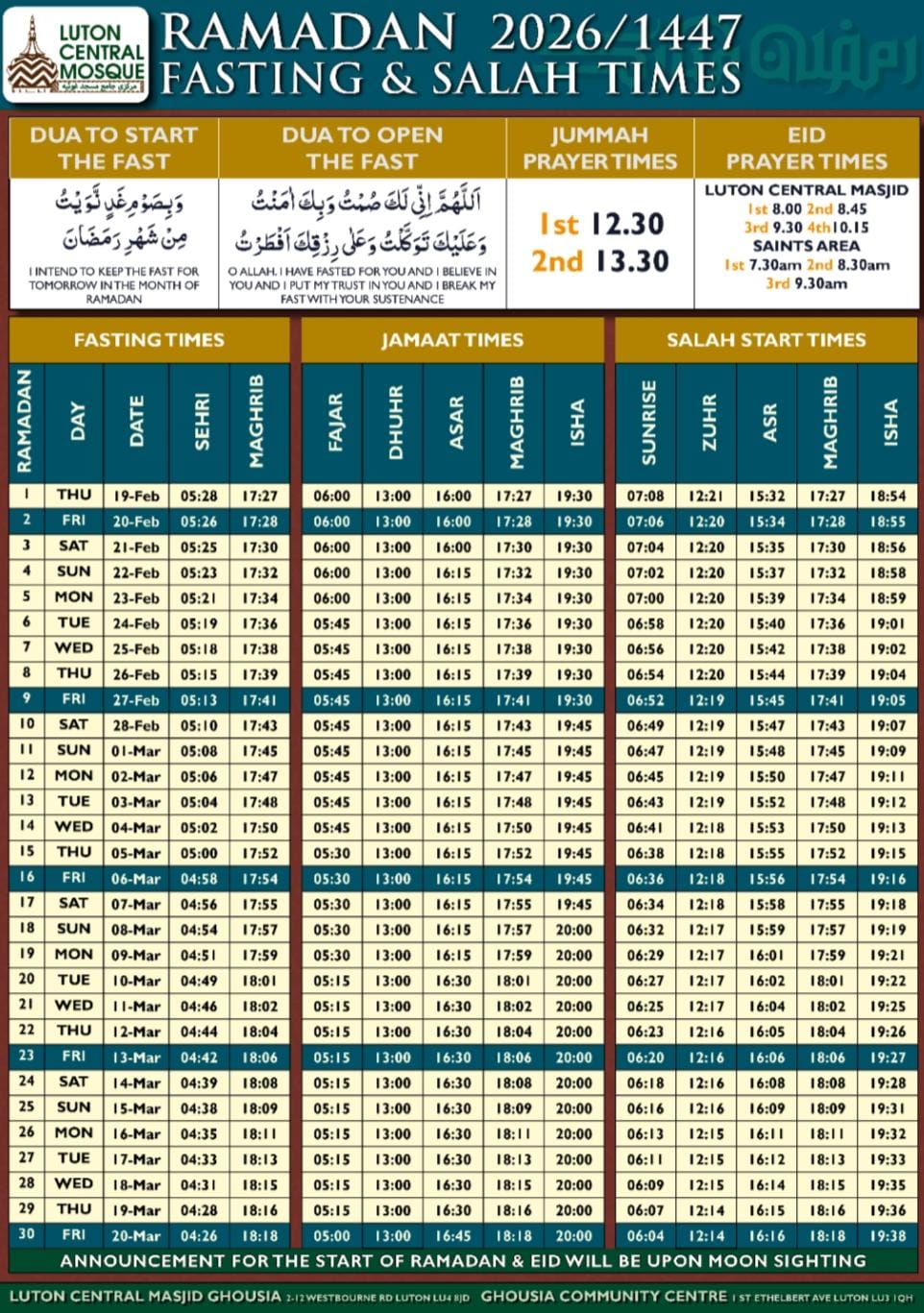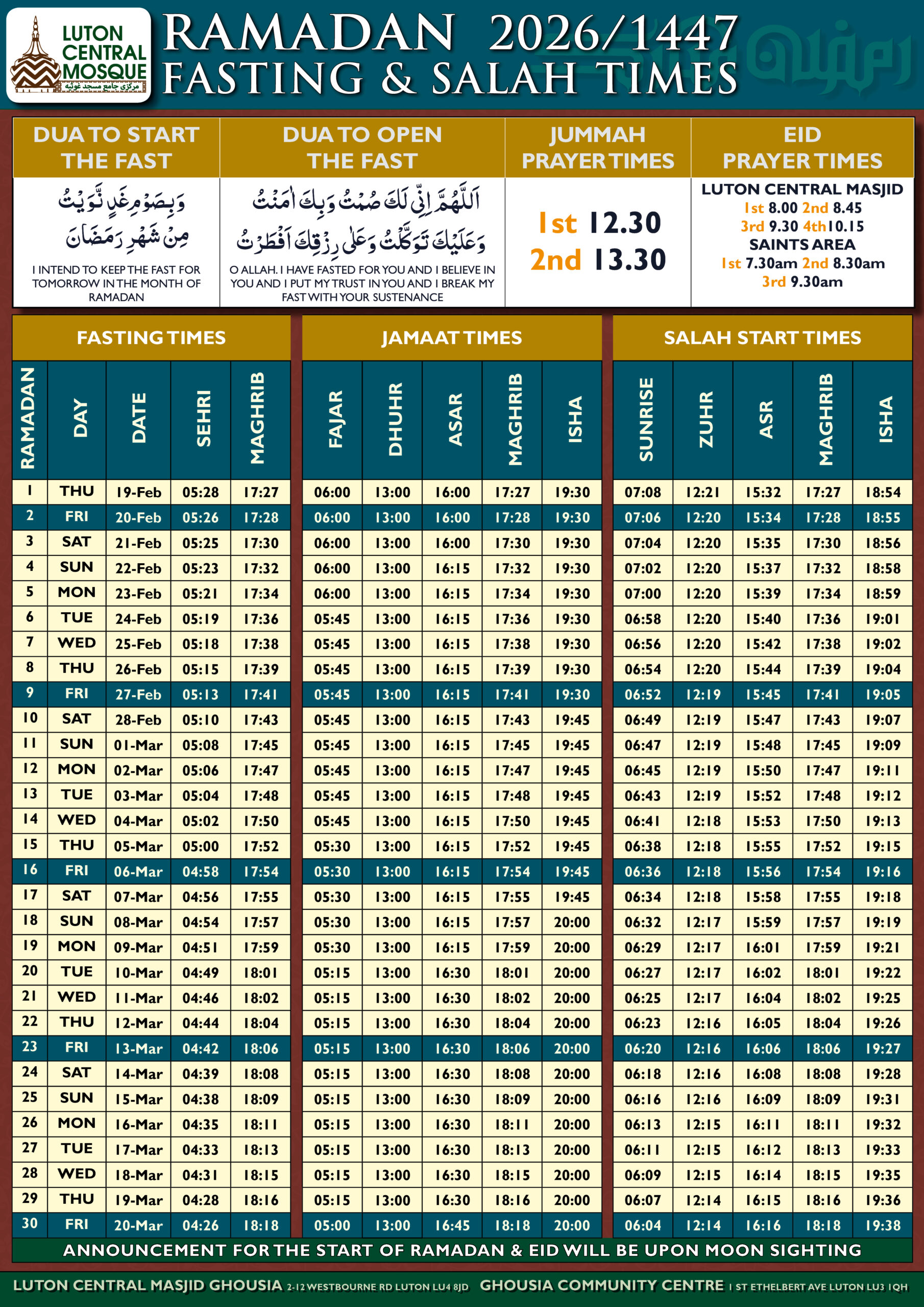 RAMADAN 2026 PRAYER TIMETABLE
